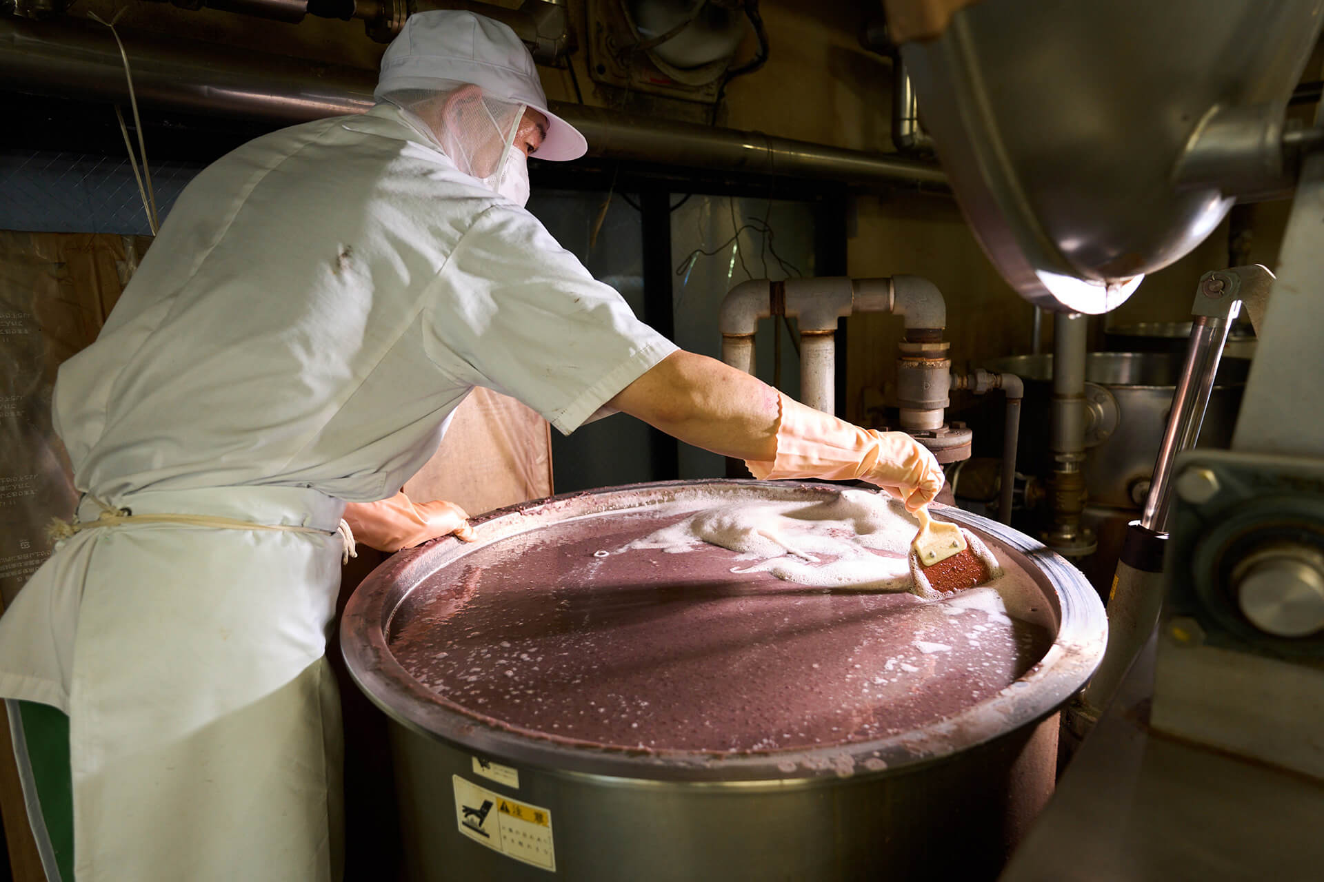 じっくり煮込んだあんに砂糖などの調味料を加え、混ぜ合わせることで清芳亭自家製あんの完成です。